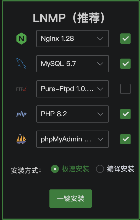 然后一键安装 LNMP 环境。