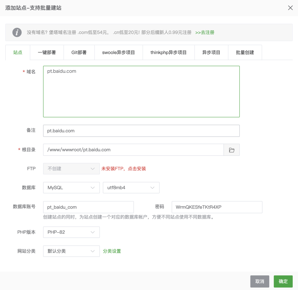 网站。点击 添加站点。 - 按提示填写域名,选择 PHP 版本,数据库,类型选择 MySQL,并使用 utf8mb4 编码。下面账号名字、密码使用系统随机生成的。然后点击提交。
