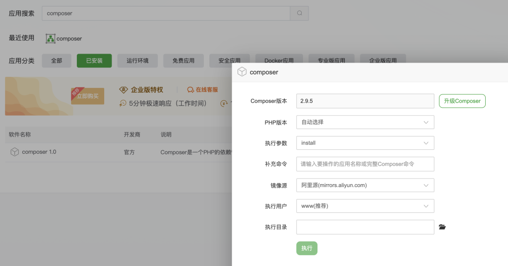 - 软件商店安装composer,并升级。